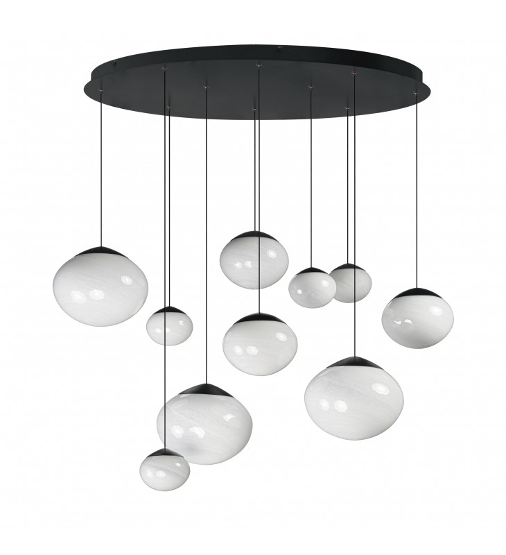 Oblong glass globe shades feature a intriguing Marble swirl pattern that obscures the integrated LED lighting within. Thin black electrical cords are easily adjustable. A larger oval 8-Light configuration features multiple sizes of the glass to create an interpretative congregation of clouds. Also available as a 3-Light, 5-Light and single pendant.