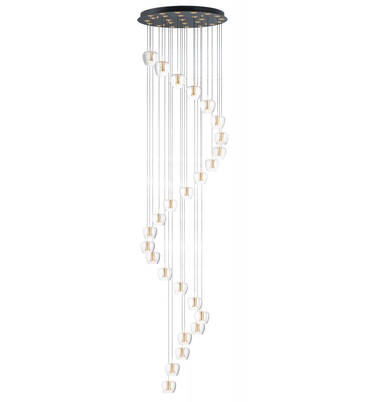 Clear apple shaped glass rest on machined aluminum fonts finished in Satin Brass with integrated LED for even Illumination without the glare. The large scale 25 light comes pre-arranged for ease of installation and is perfect for that tall ceiling application.