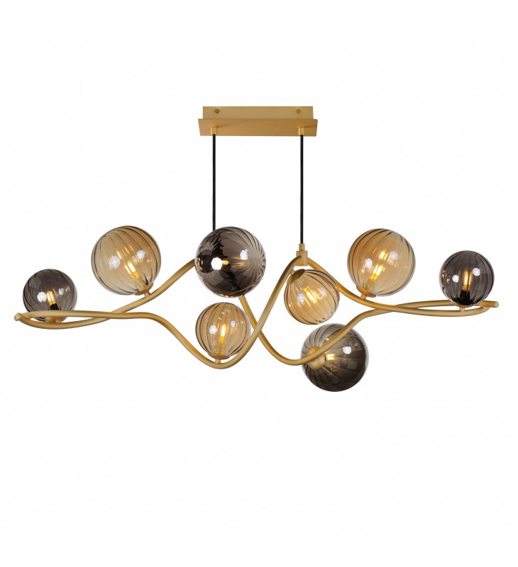 In a galaxy of light, ribbed and tinted glass is supported by swooping arcs of circular tubes. The Gold frame supports glass globe shades colored in Amber and Smoke tints that encase LED lamps provided. The single pendant has an over-sized spiraling glass shade in either Amber or Smoke, with a dome of light within and Matte Black components. Two configurations of wall sconces pair perfectly with the collection.