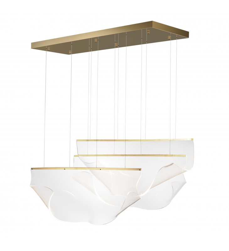 An airy arrangement of abstract forms, the Rinkle pendants feature sheets of transparent acrylic shaped by hand. The light guided acrylic captures the glow of energy efficient LEDs recessed within strips of shining stainless steel, obscuring the source of illumination. Delicately suspended by a series of thin wires, the pendants appear to be floating in an adjustable configuration of weightless light sculpture. Available in Polished Chrome, French Gold, and Brushed Gunmetal, its unique design adds a showstopping element to interior spaces.