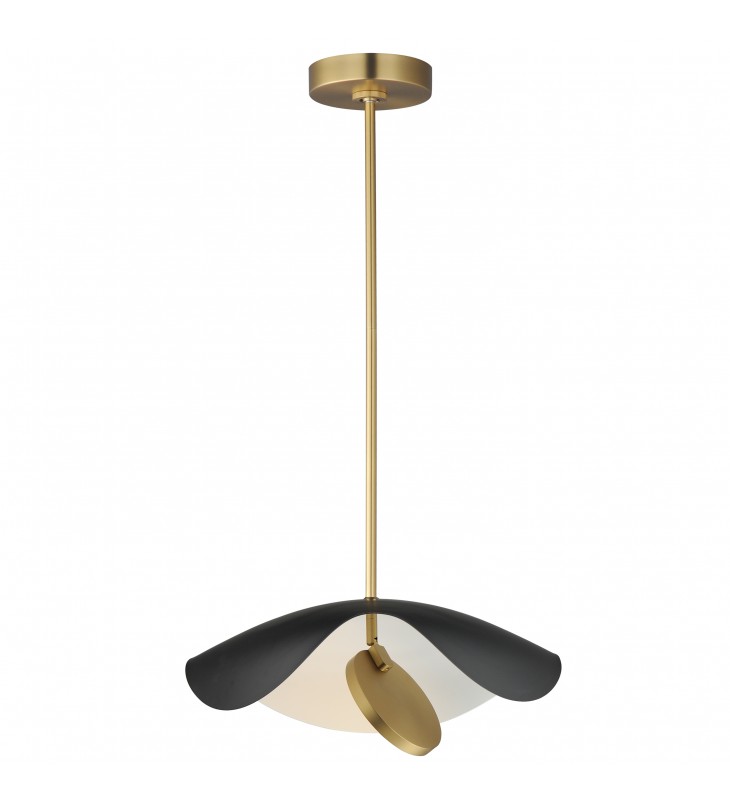 Poetic and organic in design, the undulating form of the metal shade appears to float effortlessly on a slender frame. Abstract discs of LED lighting are encased in round, adjustable heads so that the light can be directed upwards for indirect lighting reflected on the internal white painted face of the shade or the light sources can be rotated downward to provide bright illumination exactly where needed. The simple, sculptural form adds dimension in its scale evocative of a manta ray or the seductive quality of a woman wearing a large floppy hat.