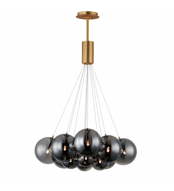 Clusters of glass globes in various sizes and color are suspended from a central point and burst outward. Configurations include a 4-Light, 9-Light, and 12-Light cluster and can be mounted close to the ceiling or included down rods to extend the height. Choose from options of Clear or Frosted glass globe clusters paired with Satin Nickel frames for an airy transitional design or be bold with Mirror Smoked glass or a varied combination of the glass including amber tinted suspended on a Matte Black frame with thin black cables. Small-scaled LED G4 lamps are included with the fixtures and centered in the glass accentuating the scale of the glass.