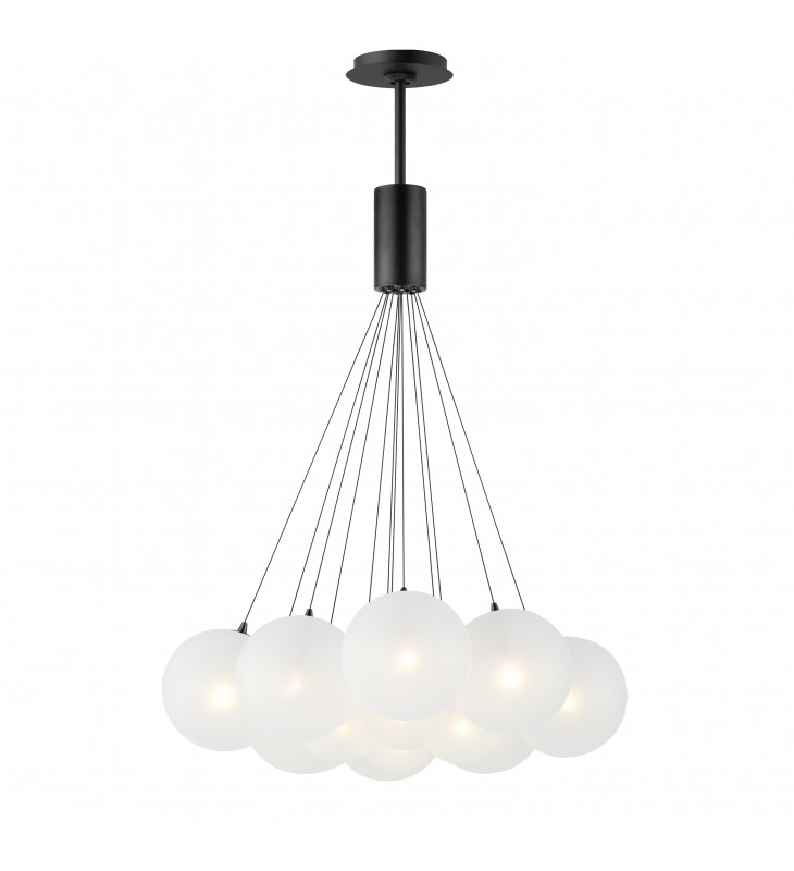 Clusters of glass globes in various sizes and color are suspended from a central point and burst outward. Configurations include a 4-Light, 9-Light, and 12-Light cluster and can be mounted close to the ceiling or included down rods to extend the height. Choose from options of Clear or Frosted glass globe clusters paired with Satin Nickel frames for an airy transitional design or be bold with Mirror Smoked glass or a varied combination of the glass including amber tinted suspended on a Matte Black frame with thin black cables. Small-scaled LED G4 lamps are included with the fixtures and centered in the glass accentuating the scale of the glass.