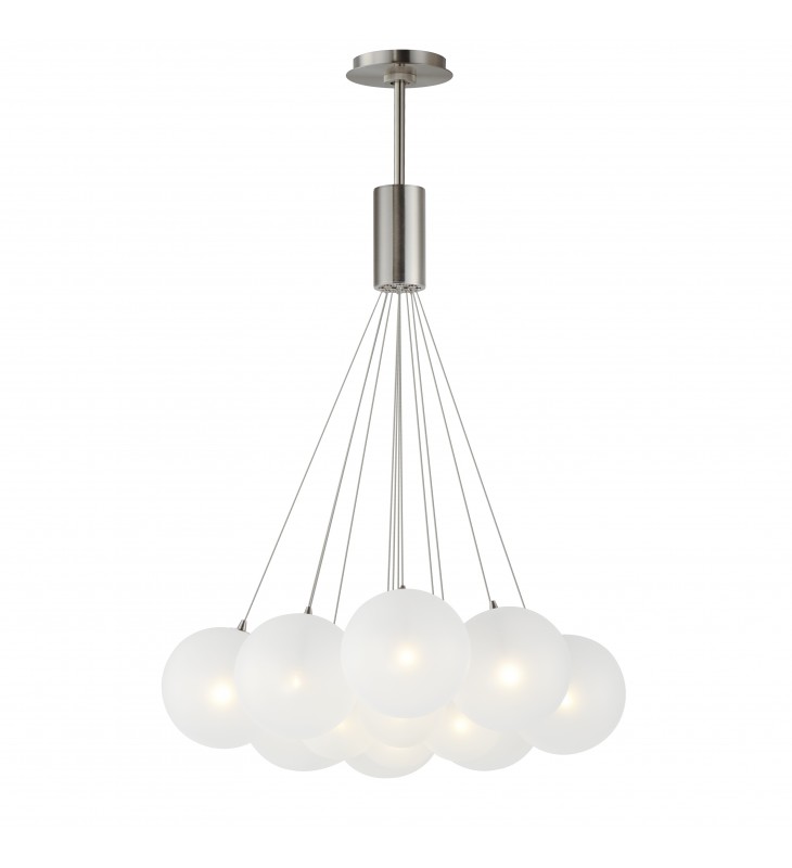 Clusters of glass globes in various sizes and color are suspended from a central point and burst outward. Configurations include a 4-Light, 9-Light, and 12-Light cluster and can be mounted close to the ceiling or included down rods to extend the height. Choose from options of Clear or Frosted glass globe clusters paired with Satin Nickel frames for an airy transitional design or be bold with Mirror Smoked glass or a varied combination of the glass including amber tinted suspended on a Matte Black frame with thin black cables. Small-scaled LED G4 lamps are included with the fixtures and centered in the glass accentuating the scale of the glass.
