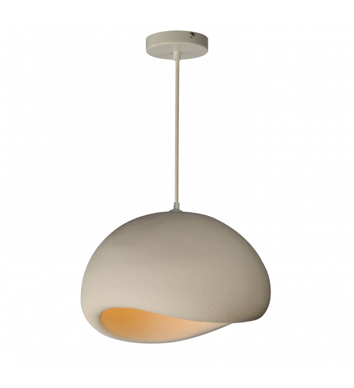 Inspired by the rocky shores of New Zealand\'s South Island, boulder-like organic forms made of polyurethane are light weight and yet voluminous masses. With a shimmery salt-like texture, the pendants are finished in an off-white Oyster finish. Choose from pendant and flush mount configurations.