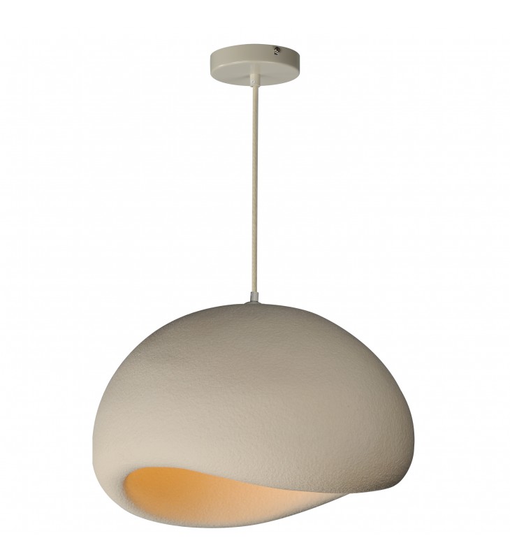 Inspired by the rocky shores of New Zealand\'s South Island, boulder-like organic forms made of polyurethane are light weight and yet voluminous masses. With a shimmery salt-like texture, the pendants are finished in an off-white Oyster finish. Choose from pendant and flush mount configurations.