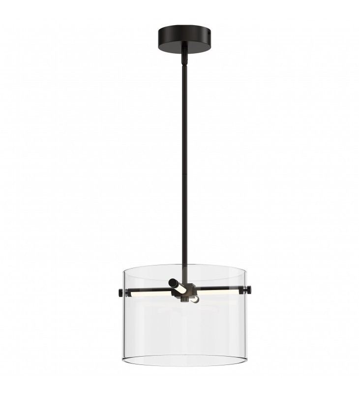Modern, Clear glass cylinders suspended by streamlined pole structures that brightly illuminate surfaces below with high powered integrated LED. Select from two finishes, Black or Gold, and two sizes of pendants, 9 or 12.5 inch diameters, as well as a coordinating wall sconce.
