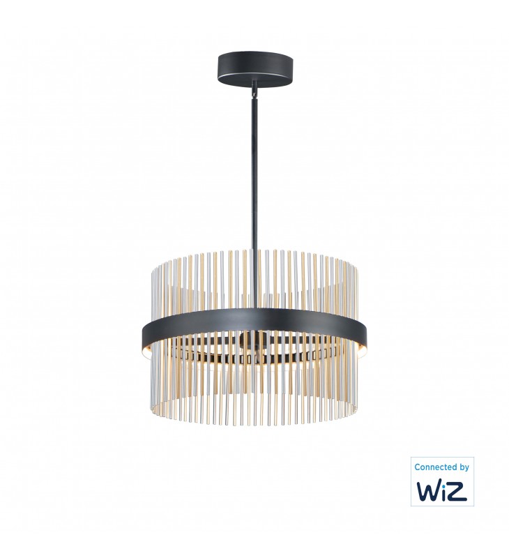 Wide bands of Matte Black metal supports an evenly spaced row of thin tubing finished in your choice of Satin Brass, Satin Nickel or a combination of the two. The stylish design is connected by WiZ that enables the lighting\'s White Ambiance between 2700-5000 Kelvin. Marvel at the ring\'s soft indirect lighting dispersion cast light both up and down and shine along the tubes aglow. Set daylight white options for concentration tasks and energize your body. Similarly take notice of the effect when setting a warmer tone at the end of the day or to add some ambiance.