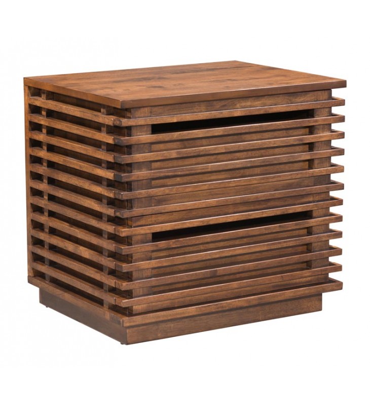 Inspired by Scandinavian modern design, this slatted two-drawer nightstand and end table in solid fir wood and walnut veneer is a handsome addition to any bedroom. Each drawer top has a wide space allowing for easy access with no hardware required. Sturdy construction keeps it stable when in use. Beautiful linear slats are on the front and both sides. Pair with the Linea bed, dresser and high chest.