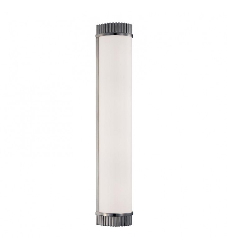 Benton? expanse of opal glass appears all the more smooth in contrast to its textured end-caps. The deeply cast ?eeth·of Benton? industrially inspired metalwork add unique detail to the contemporary sconce. Our attention to quality design shows in the matching texture of the fixture? knurled thumbscrews.