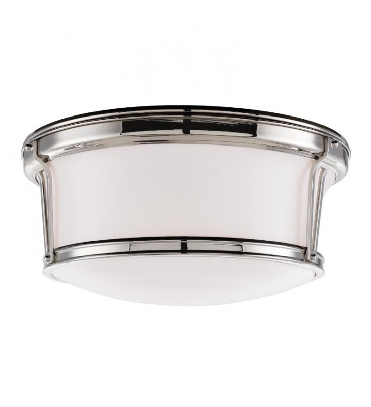 Sometimes, a flush mount is at its best when it plays it simple. Our Newport does just that, placing the soft curves of its glossy opal diffuser between two parallel metal rings. Riveted clasps provide an attractive accent while subtle embellishments add gravitas to a classically elegant fixture.
