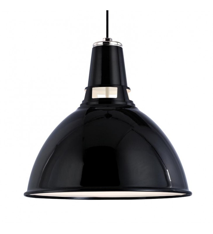 Glossy enamel coats the industrial metal shade, giving Lydney an element of glamour. Adding an additional touch of sophistication, cloth-sheathed wiring runs from canopy to shade. As for the light itself, cutouts direct additional light toward the ceiling, while the interior is entirely finished in white, amplifying the light-source.