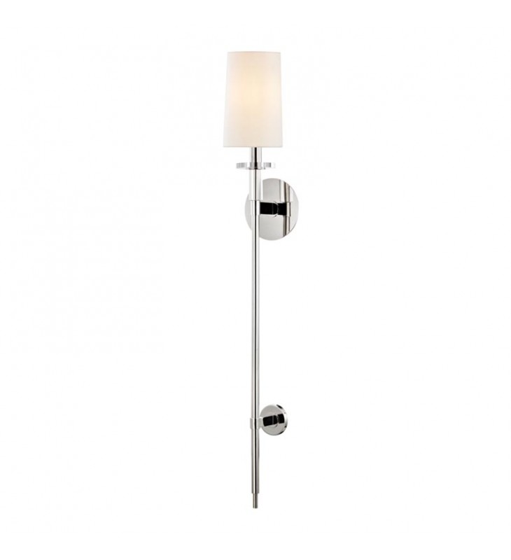 The elongated torch handles of our Amherst family shun needless complexity, resulting in smooth sophistication. Crystal accents give it a 21st-century twist. White fabric shades top the tall tapers, complementing the cylindrical shape of Amherst? crystal bobeches.