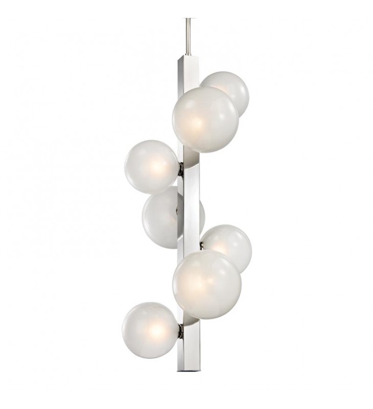 Playful and minimal, orbs of light cluster around a square metal beam as if some unseen magnetism were at work. Hand-blown glass spheres are finely etched inside while maintaining a clear glossy sheen on the outside. The result is a pleasing diffusion of light. Hinsdale exhibits sophistication and confidence.