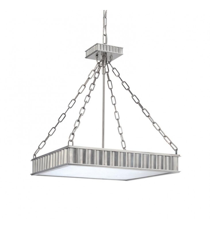 Rich metal fluting conceals the light source in our Middlebury family. The pendant? chain-hung design bathes ceiling space in a warm wash of ambient light and cascades the glinting chains in the same. A glossy opal glass diffuser softly diffuses light into the space beneath.
