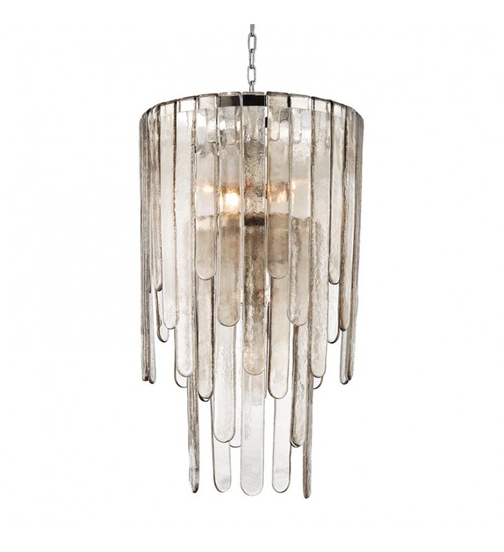 The trial-and-error nature of our creative process made Fenwater a delightful discovery, where the end product exceeded its initial intent. Here? how it works: our artisans pour molten glass into molds of three different lengths. By design, the glass is rough and champagne-hued to suggest a degree of antiquity. The hooked glass panels hang in a three-layered cascade in staggered lengths. The resulting appearance is at once warm and woozy, watery and icy.