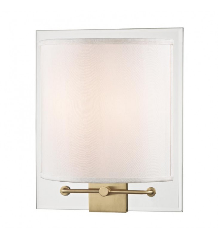 A beveled piece of glass creates the frame for our impressive Peoria family. A wide silk shade takes the foreground, wrapping around the bulb and into the glass. A piece like a drawer pull crosses over and complements the backplate. Peoria presents a sophisticated m?ange of textures and shapes.