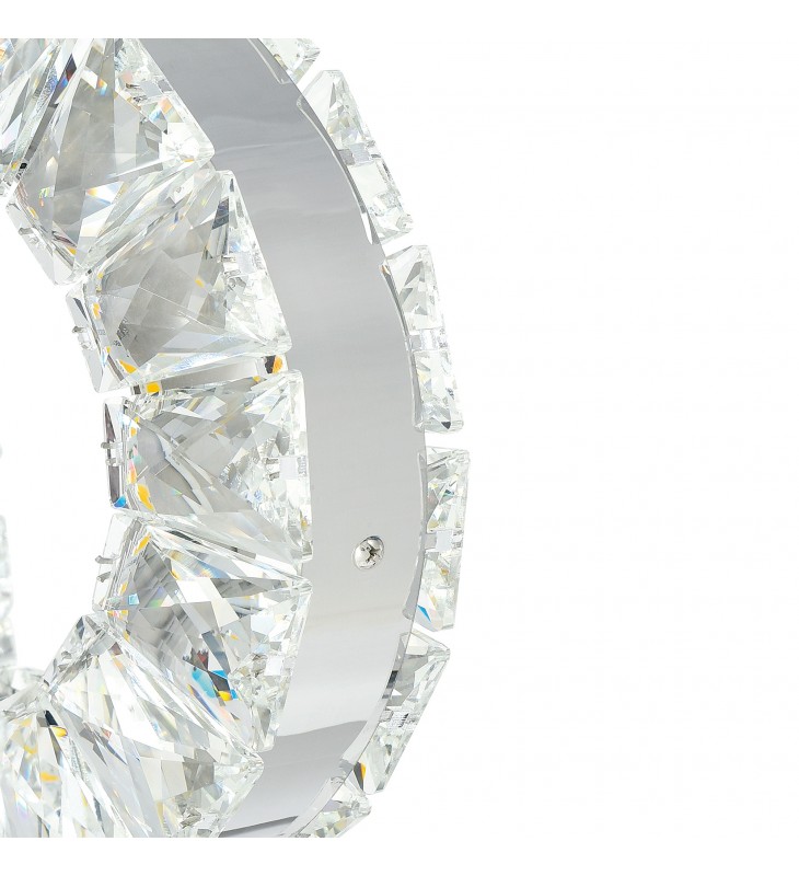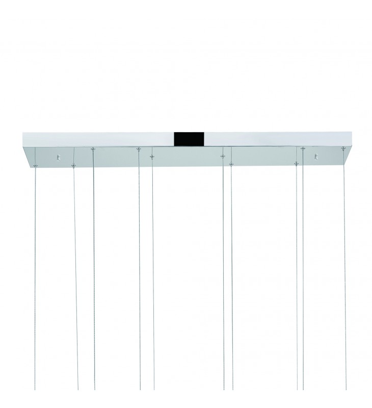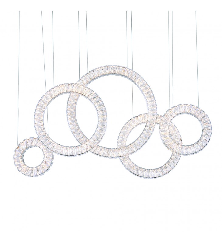 The 43 inch Celina LED Chandelier Pool Table/Island Light would make a fine focal point in itself even when unlit. This oversized pendant light features five interlocking rings wrapped in glittering crystals. A rectangular chrome canopy holds the ring in place in linear formation. This striking light fixture can certainly provide any space with great lighting and ambiance.