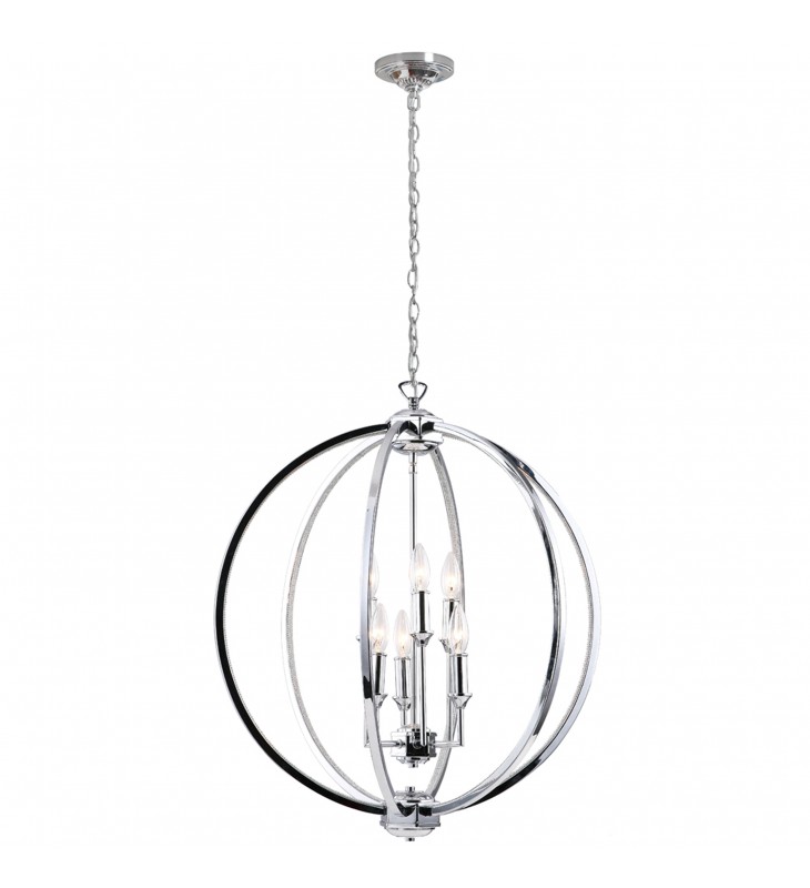 Dainolite Contemporary Karland Hanging in Electroplated Polished Chrome Metal for the Ceiling with 6 bulb, E12 socket base 60 Watts max Dimmable and UL Approved for Damp Location with a 1 Year Limited warranty. Great for Dining, Foyer/Hall, rooms and Commercial use. Features include , ,