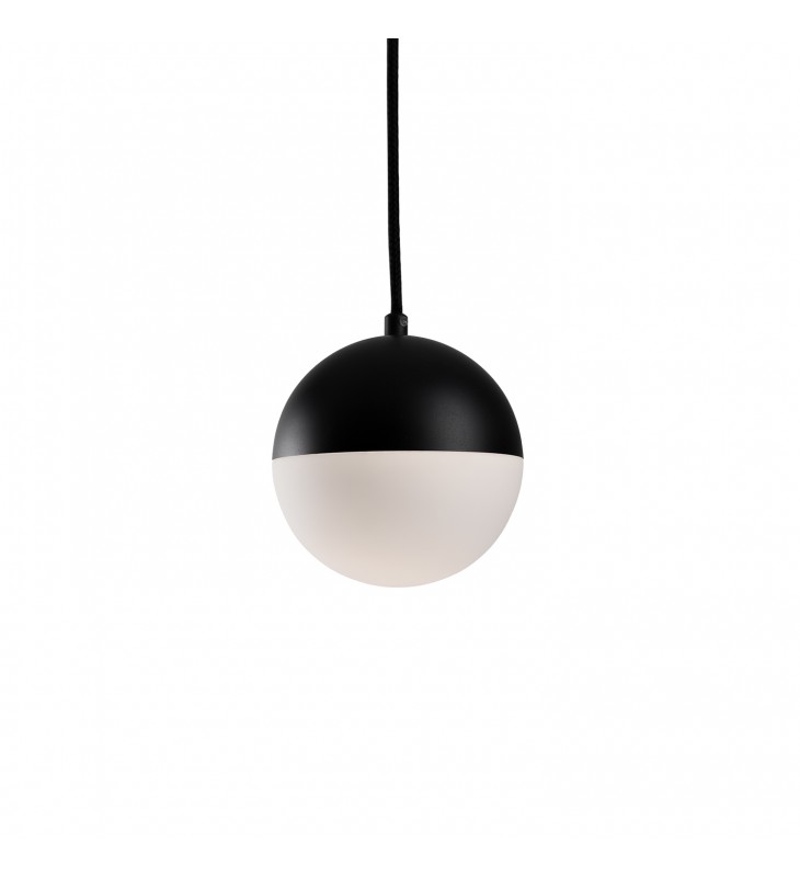 Single LED retro styled orb shaped pendant. The top semi sphere is painted black metal which connects at the equator of orb to complete the bottom of the fixture with a semi sphere shaped white opal glass. When lit the light shines evenly throughout the bottom glass and into the surrounding area. Matching black clothed covered SVT cable with our powerful 12V AC LED technology. Available in three different sizes.