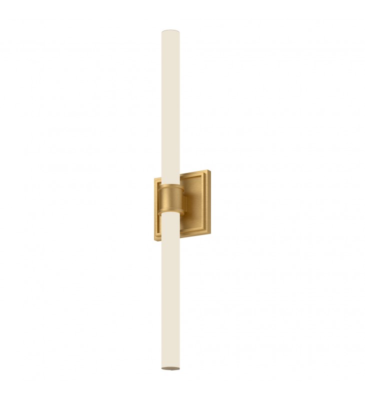 A tubular length of illuminated rod the Rona wall light is supported and clasped with a detailed cylindrical projection. The thick square outline of the attachment plate frames the lamp holder and echoes the refinement of present architectural trim. Available as either a sconce or vanity and in several curated finishes.