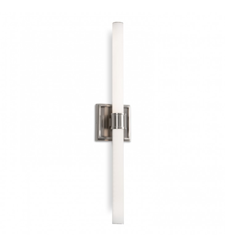 The LED vanity is composed from a thin cylindrical opal shade clasped by a concentric plated metal tube. The visually lightweight lamp appears to float off the surface of the wall, with a minimal yet sturdy point of attachment. Uncomplicated design and considered details merge into a versatile fixture with both horizontal and vertical potential orientation.