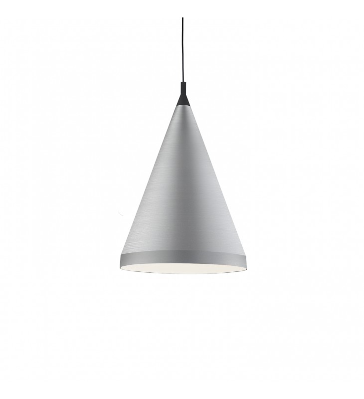 Single lamp pendant with conical aluminum shade with fine powder-coated or plated finishes with contrasting finial. Exterior shade colors are black or white with gold detail or brushed nickel with black detail. Suspended by cloth cable. Available in 2 sizes.