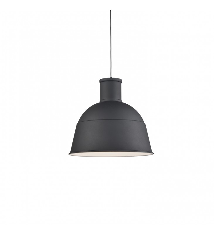 Single-lamp pendant with aluminum dome shade showcasing powder-coated finishes. Exterior shade colors are black, white or blue, with matte white interior. Suspended by cloth cable to a maximum 120\" length. Available in three sizes.