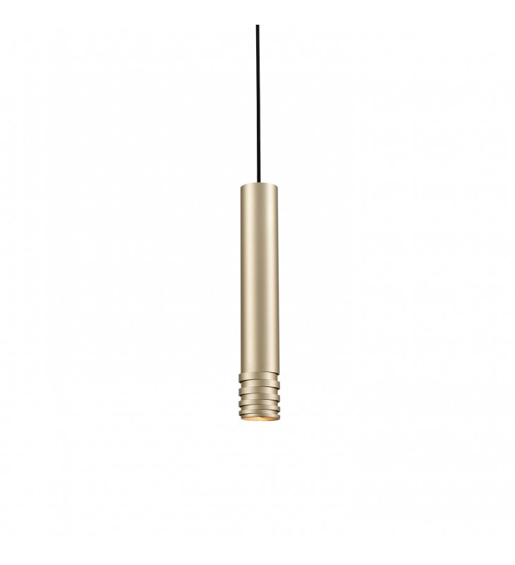 Single lamp pendant with steel cylindrical shade embellished by stacked tubular slices. Primary color configurations include black, gray, brushed nickel or gold with a matching interior. Suspended by a black Teflon cable