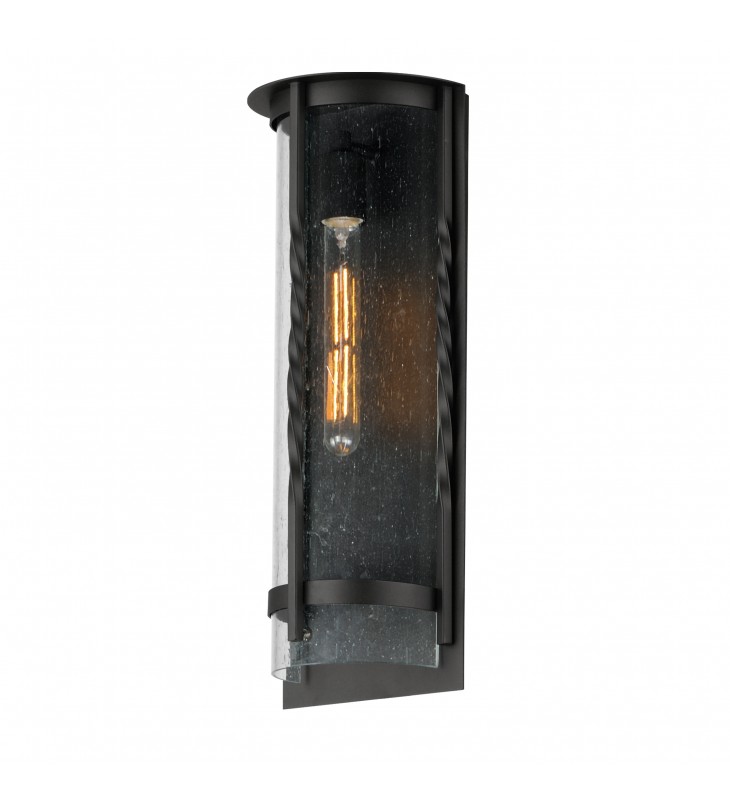 Forged iron spindles twist along the frame of a half round sconce. Transitional in design, they are finished in a Neutral Black outdoor rated powder coat and feature Clear Seeded glass. Use tubular lamps to accentuate the height of the sconces.