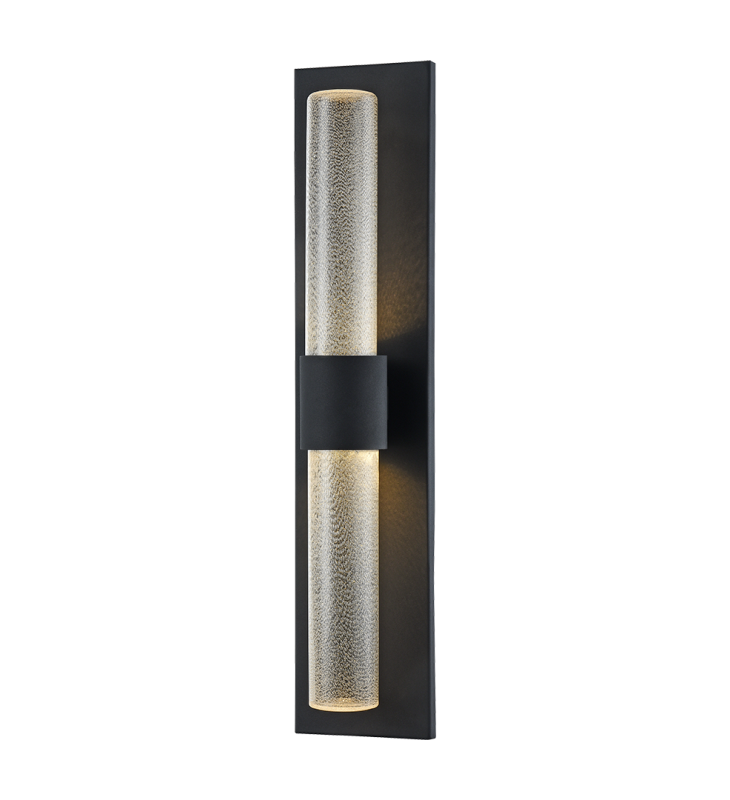 Likwid is a simplistic yet sophisticated wall mount series. Offered in an elegant Matte Black finish combined with a seeded water look glass shade. An LED non visible light source completes the style making it not only a beautiful piece but practical as well. It can be place in both dry and damp locations.