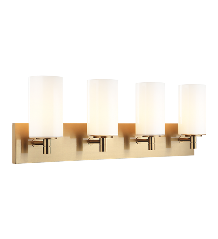 The Candela series is a transitional style vanity pillar shaped glass. Three finishes, Aged Gold Brass, Chrome, Matte Black in either Clear or Opal glass shade.