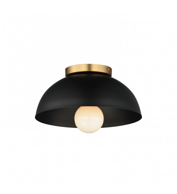 Dome shaped shades in Matte Black contrast Natural Aged Brass accents. Available in flush mount, bath vanity, and swing arm wall sconce configurations. This collection delivers an approachable, modern design that pairs well with transitional design aesthetics.