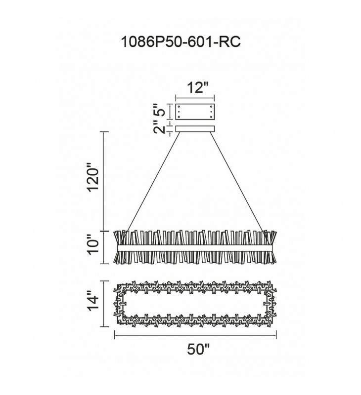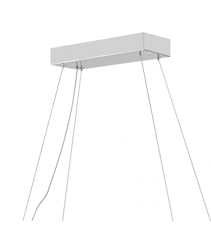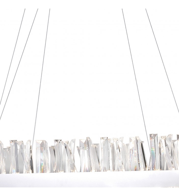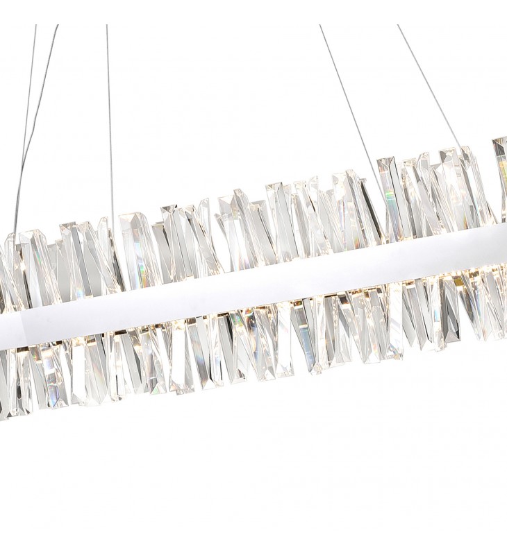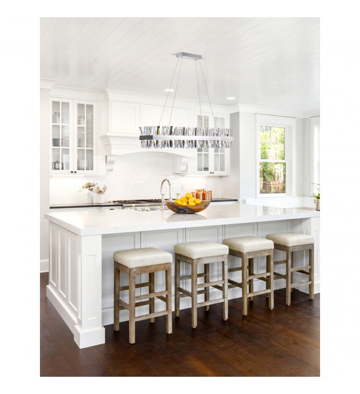 Bringing an exceptional aesthetic to the kitchen is the Faye LED Rectangular Supersized Chandelier. A large rectangular metal frame in chrome finish is artfully decorated with clear crystal spears in haphazard linear placement. The 50 inch long gleaming pendant suspends from thin cables connected to a round canopy. This light source is best placed over a kitchen island. Count on this indoor lighting\'s distinct and decorative presence to provide your space with an indulgent character.