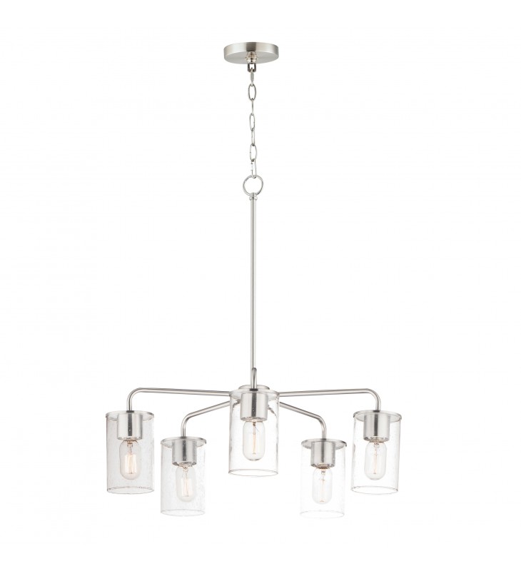 Cylinders in Clear Seeded glass on simple Satin Nickel frames or matte Black frames with Antiqued Brass socket covers. Pivoting arms on chandelier allow it to direct light up or down. Use filament lamps either tubular or Edison in shape for a Coastal or Industrial look, or use a traditional A19 to create a more transitional look. A full range of affordable lighting for the kitchen, dining room, bathroom, or bedroom that easily complements fashionable finishes and lasting styles.