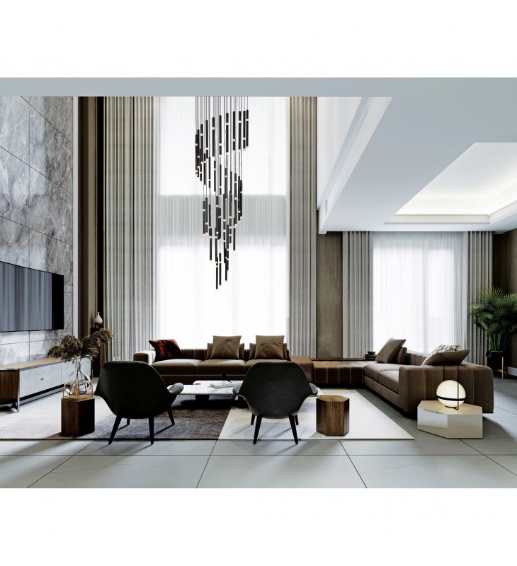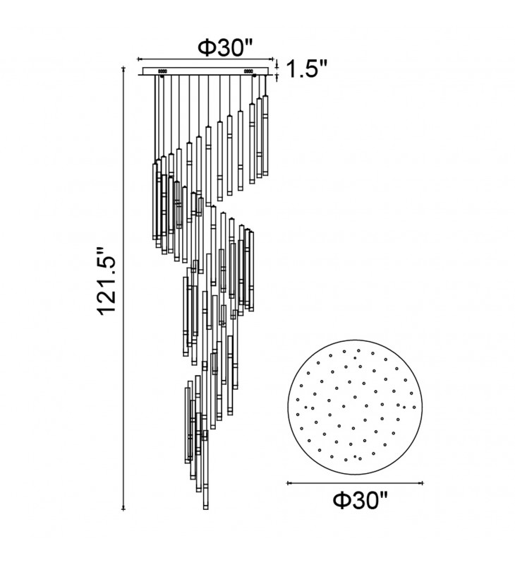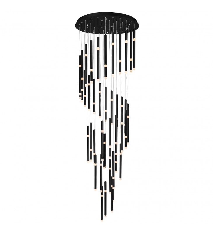The showstopping Flute 54 Light Chandelier is not just a light fixture but a home decor statement piece. Suspending from a 30 inch black round canopy are 54 bulbs ready to give a luxurious glow over your hallway, stairwell, or living room. This contemporary chandelier is set to give an extra touch of style to your space given its sleek spiral silhouette.
