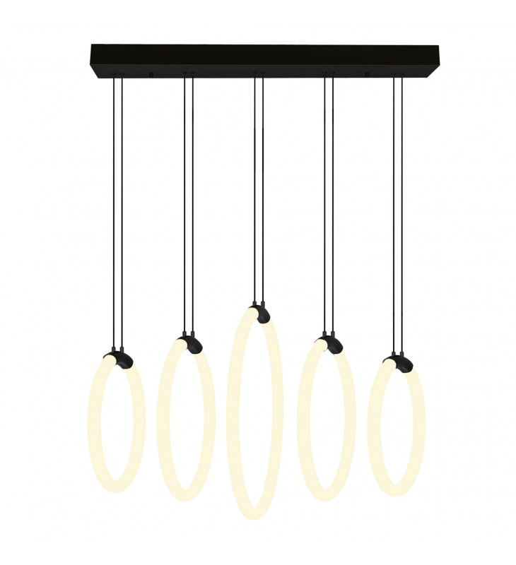 The Hoops 5 Light Ring LED Chandelier is ready to deliver a diffused and delicate light that will make any space look and feel more inviting. This multi Pendant light fixture is designed with a horizontal arrangement to feature five LED rings suspending from a rectangular canopy in black. With the light rings looking as if they\'re floating, this handsomely crafted light fixture will not only bring illumination to a room but will also become a striking statement piece. \n