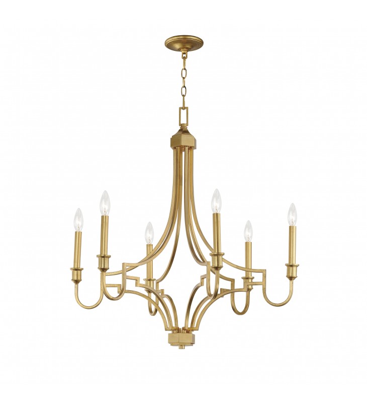 Gallant in hand-applied Gold Leaf, the Normandy collection is a look befitting a chateau of the Middle Ages. Both traditional and handsome, the exposed candelabras are gilt in matching Gold Leaf sleeves as they perch at the end of decorative bobeches. The sharply-angled curves of the arms anchor to polygonal elements adding a tailored elegance to the chandelier\'s design. Thoughtful in its composition, the collection provides an authentic interpretation to a classical concept.