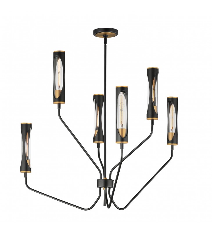 Glamourous and modern, this two-toned lighting collection plays with form and scale. A layered composition of materials, tubular lamps are protected within glass tubes sheathed in metal shades with oval cut-outs that reveal the light source. Chandelier Arms extend in elongated, uneven heights while the sconces are over-scaled for dramatic applications. Available in contrasting finish combinations of Light French Grey with Natural Aged Brass or Matte Black with Antique Brass, the vibrant color palette plays with contrast and exudes luxury.