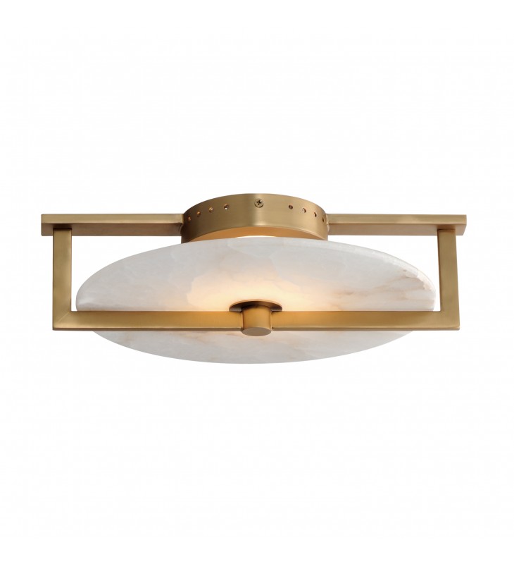 Modern in execution, the Quarry collection features natural Spanish alabaster in an iron frame finished in Darkened Bronze or Natural Aged Brass. Dedicated LED housing shine light on alabaster panels, highlighting the stone\'s beautiful, veined characteristics while also providing ambient lighting. These surface mounted fixtures are designed to install on either wall or ceiling surfaces.