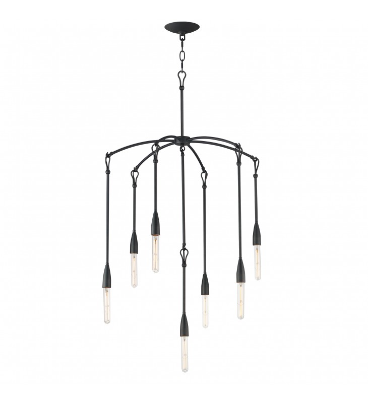 Simple with rustic elements, elongated rods are tiered with a forged iron hook and loop detail in multiple configurations. The fixtures\' textured Anthracite finish enhances the artistry of the forged iron construction. Available in multi-pendant configurations as well as a single pendant and sconce. Use tubular filament lamps to accentuate the verticality of the design.