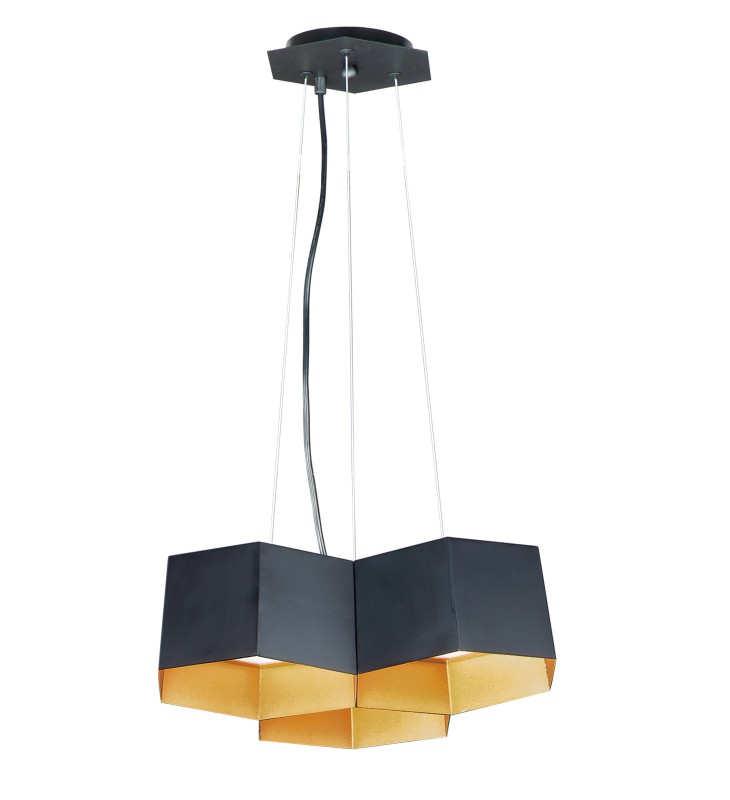 A series of hexagonal metal shades are slightly tapered to create a gentle arc when suspended together. The dramatic combination of Black with Gold interior adds flair to this unique and bold design. Ample illumination is provided by high power integrated LED and softened by acrylic diffusers recessed into each compartment.