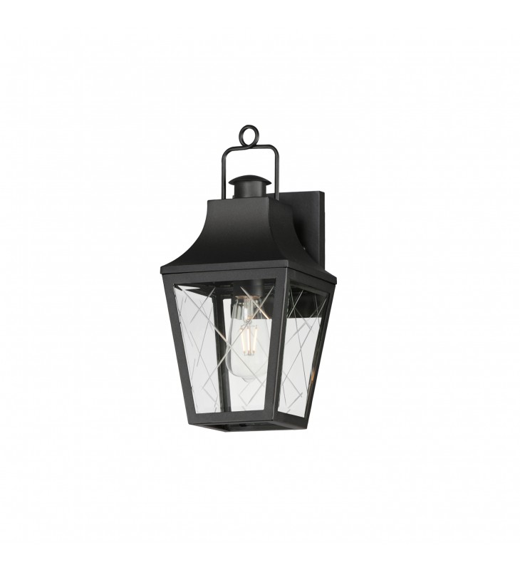 These charming cottage style lanterns feature unique cross-etched glass panels that are Clear and beveled along their edges. Additional design details such as whimsical loops above a chimney element add to the product\'s delightful appearance. Finished in a Matte Black outdoor rated powder coat, this collection recaptures the appeal of storybook lanterns.