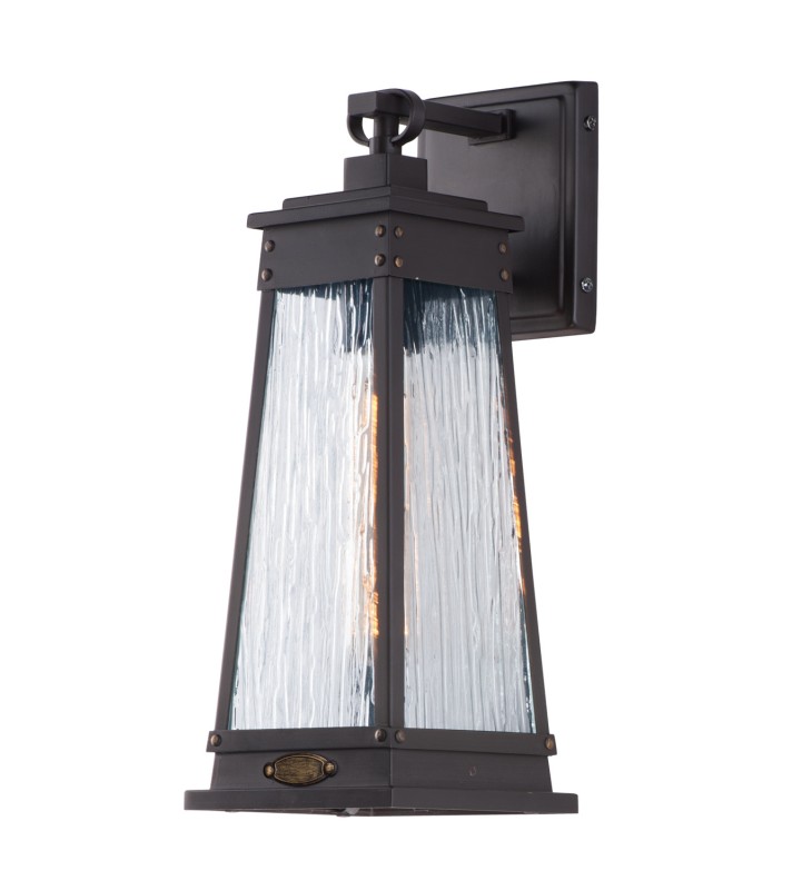A tapered square shade finished in Olde Brass suspends from a bracket to replicate a nautical lantern. Panels of clear Ripple glass allow for the lamp to shine through while still diffusing the light. The medallion at the base of the shade and rivets along the frame are finished in an antique brass to add authenticity to the design.