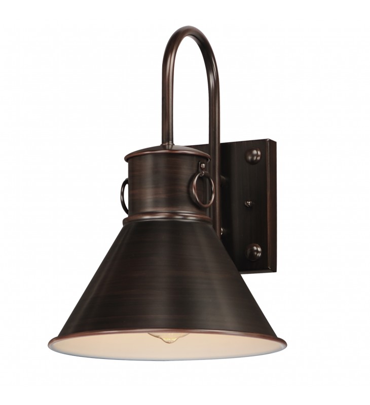The conical metal shades on these outdoor sconces draw inspiration from?the heartland using embellishments?such as riveted accents?and fastened rings to add rustic charm. The products are?finished in a rich?Bronze outdoor rated powder coat, and?complements similarly styled exterior elements such as honed?stone facades and wood?siding.