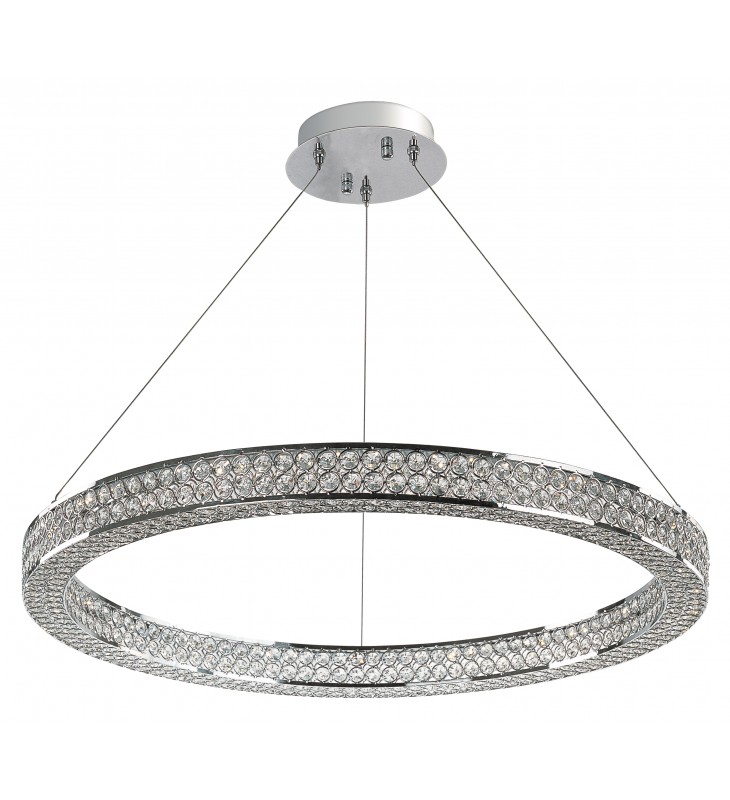 Frames of metal rings encased with Beveled Crystal Jewels, are finished in Polished Chrome. Suspended by cables as if floating In air, these rings cast rainbows of light when illuminated by the Integrated LED.