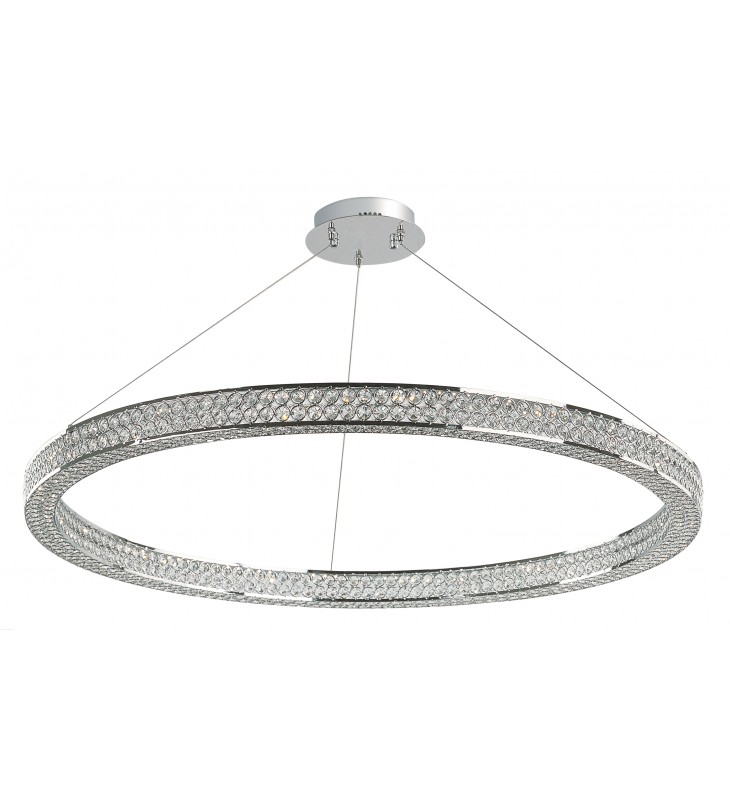 Frames of metal rings encased with Beveled Crystal Jewels, are finished in Polished Chrome. Suspended by cables as if floating In air, these rings cast rainbows of light when illuminated by the Integrated LED.