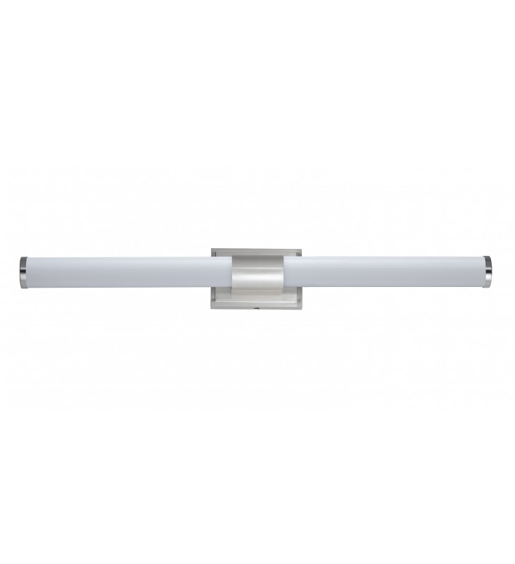 Cylinders of White cased glass are mounted onto a cast aluminum frame of Satin Nickel or Polished Chrome. LED modules evenly illuminate and provide soft yet ample illumination. Multi volt input is standard which allows for installation into commercial applications.