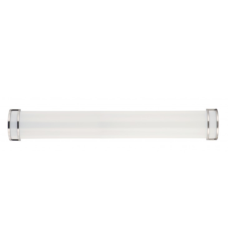 Commercial grade energy efficient lighting featuring linear frames of metal finished in Satin Nickel diffused by an etched opal acrylic creating an updated energy efficient classic.