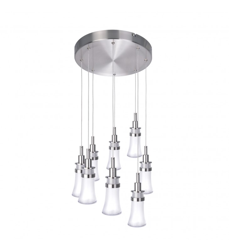 On a polished nickel frame, suspended by ultra thin cable, the \"Destiny Collection\" is very stylish and sets itself apart from the crowd. The LEDs sparkle through the white glassware which is clear on the edges. Many configurations available.